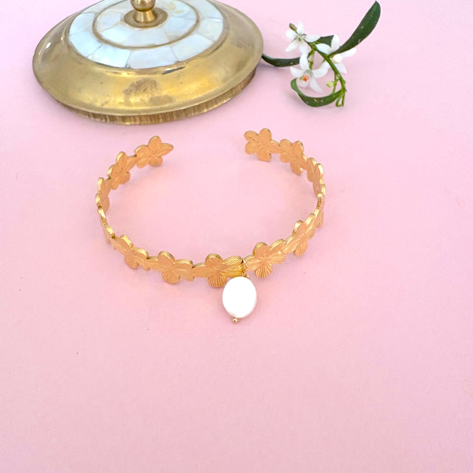 Un bracelet en laiton plaqué or avec des petits pendentifs en lapis lazuli.